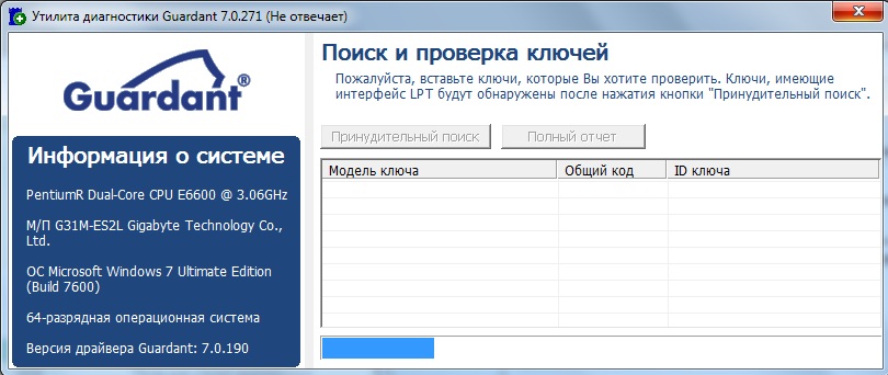 В одной из подобных ситуаций была запущена диагностика ключей. Программа диагностики подключенного ключа не увидела, более того, она также перестала отвечать. Скриншот ниже. Программа программирования ключей также зависла не увидев подключенного ключа. После извлечения ключа программа программирования ожила и возобновила работу, а диагностика продолжала висеть и ее процесс пришлось завершать принудительно.
