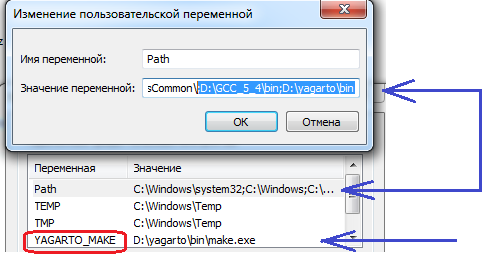 •    вносим некоторые изменения в переменные окружения. Для переменной Path добавляем в конце полные пути к папкам bin из распакованного архива и установленного пакета YAGARTO через точку с запятой (должно получиться примерно так: D:\GCC_5_4\bin;D:\yagarto\bin). Если до этого уже был установлен комплект YAGARTO, то необходимо проверить существующий путь к папке bin в переменной Path. Таким образом в поле значение в самом конце должно быть как на скриншоте: