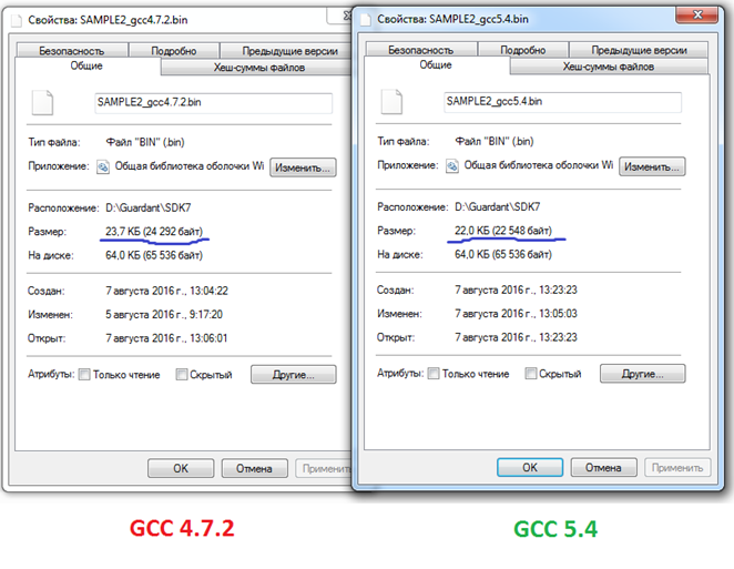 Далее приводятся скриншоты свойств двух бинарных файлов из примера #23 - Math Functons Sample (Delphi) из Guardant SDK, скомпилированных разными версиями.