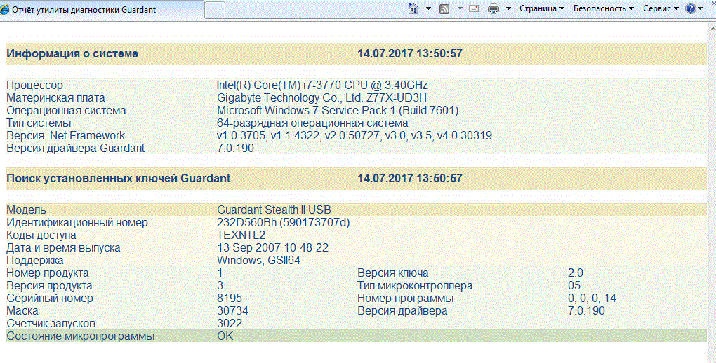 Добрый день. Судя по отчету утилиты диагностики ключ исправен. Проверьте работу защищенного приложения на других рабочих станциях. Уточните, не менялась ли аппаратная или программная конфигурация данной рабочей станции?